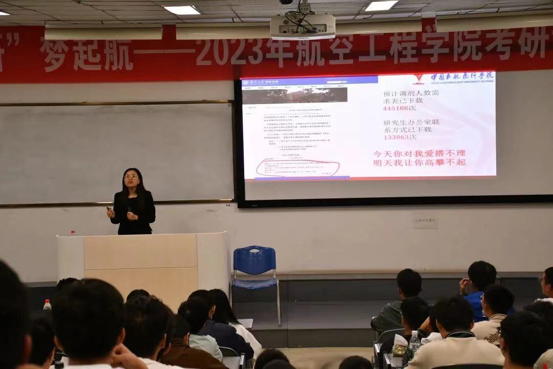 罗莉莉通过将考研与考公、出国进行对比,明确指出了考研的内容以及难度,从考研的四个科目出发,深入分析了考研的重点和难点,并结合南航、北航等考研院校进行了具体分析。冷书恒以视频《我不想做这样的人》为开头,讲述了自己考研和考博的经历,并从提升信心、制定计划等十个点来深入讲解了如何准备考研。熊巧巧指出考研最重要的便是反复练习,大量的积累能够让自己遇到难题时做到临危不乱。在交流环节中,同学们提出了自己关心的关于考研的各种问题,得到了详细的解答。