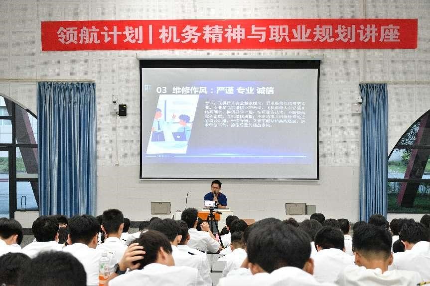 钱鹏与台下同学积极互动,对同学们提出的问题耐心解答,并指出机务工作最重要的就是严谨务实、遵章守纪,我们要时时刻刻敬畏生命、敬畏规章、敬畏职责。