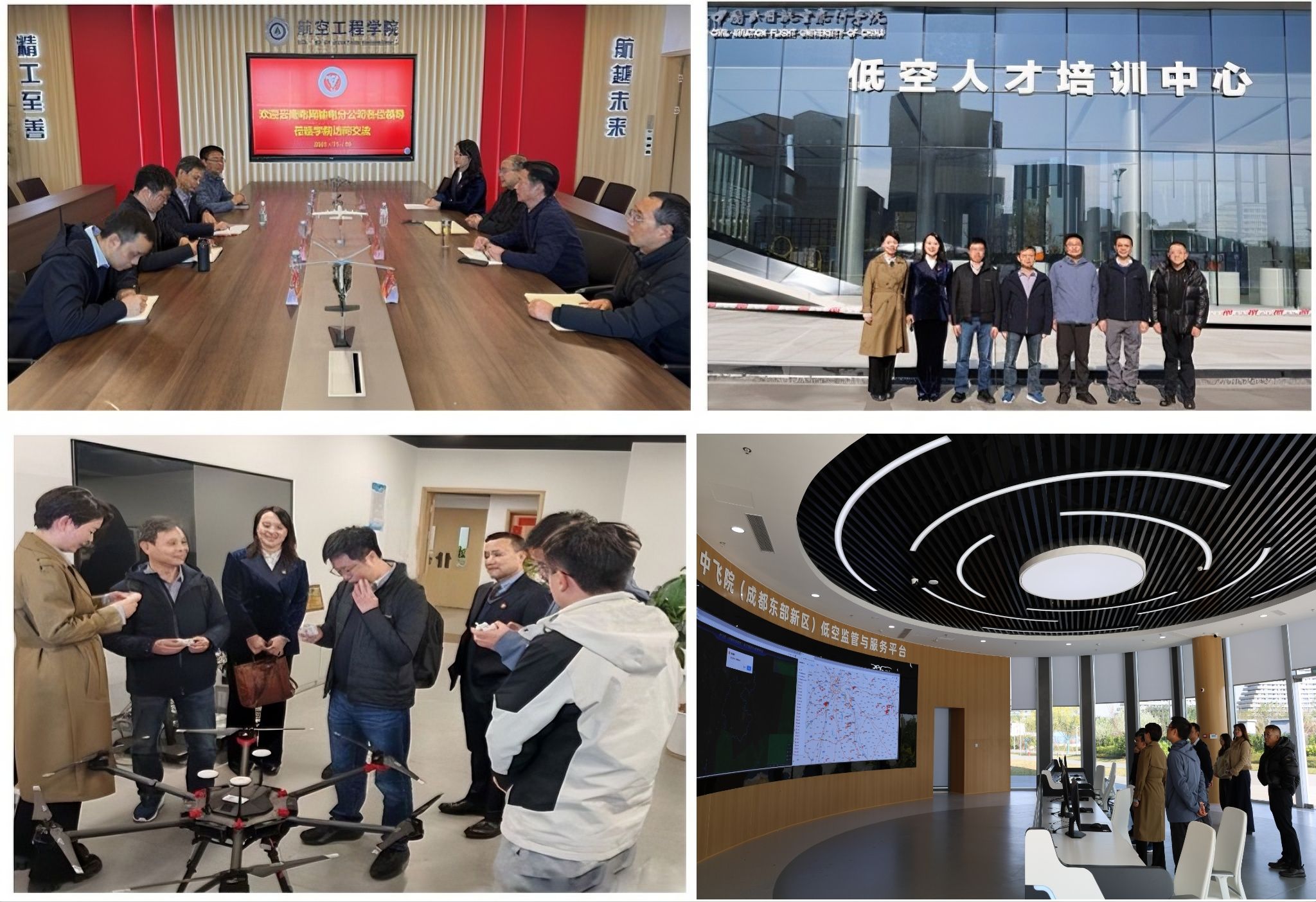交流活动中,云南电网有限责任公司输电分公司各位领导先后参观了航空电子电气学院实验室和低空人才培训中心,深入了解了实验室的科研设施与技术创新成果。在参观低空人才培训中心过程中,谭壹方主任介绍了中心的培训设施、人才培养模式以及技术研发成果。双方围绕无人机在输电线路运维的应用、通用航空运维人才联合培养等话题展开深入交流。