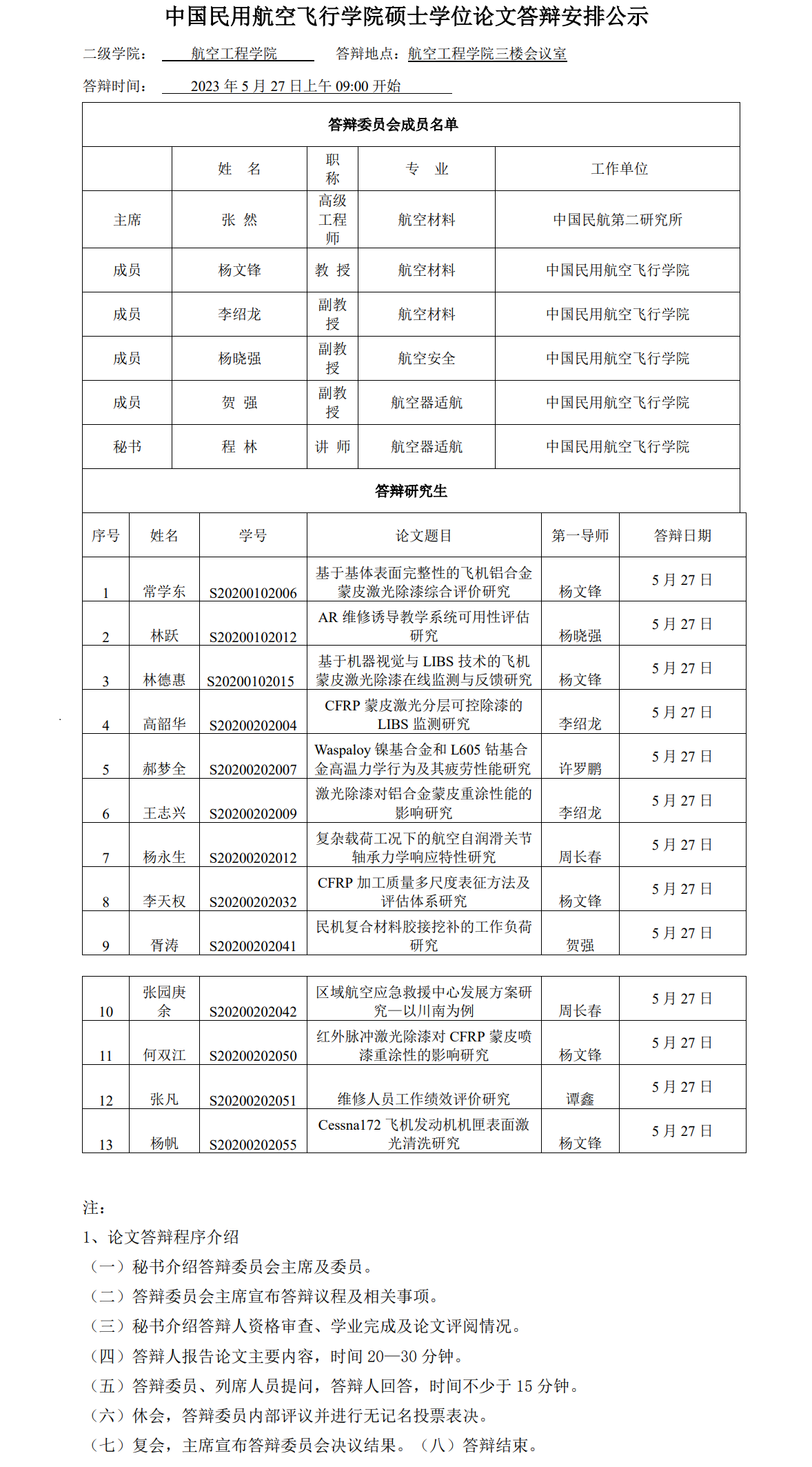 航空宇航科学与技术(机械)2023届优秀硕士学位论文推荐名单公示